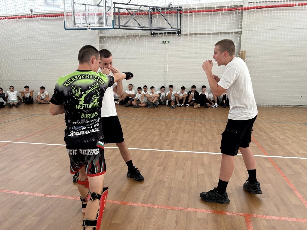 Динамика и адреналин внесоха Александър Стоянов от 12г клас и Светослав Караманов от 9а клас, състезатели по кикбокс в СК „Нефтохимик“. Те не само направиха демонстрация, но и обучаваха желаещите ученици на основни техники на удари с ръце и крака, показвайки, че бойните спортове са отличен начин за поддържане на форма и самозащита. А ето какво сподели с нас Александър: „Не можеш да си завършен спортист, ако не си и образован човек. За мен спортните постижения и качественото образование са неразделни – те оформят истинския шампион. Кикбоксът ми даде силата да се боря, а училището – мъдростта да знам защо.“