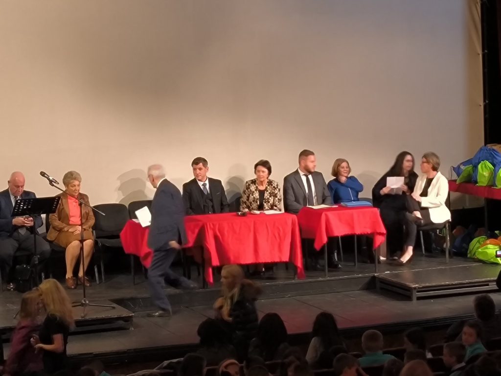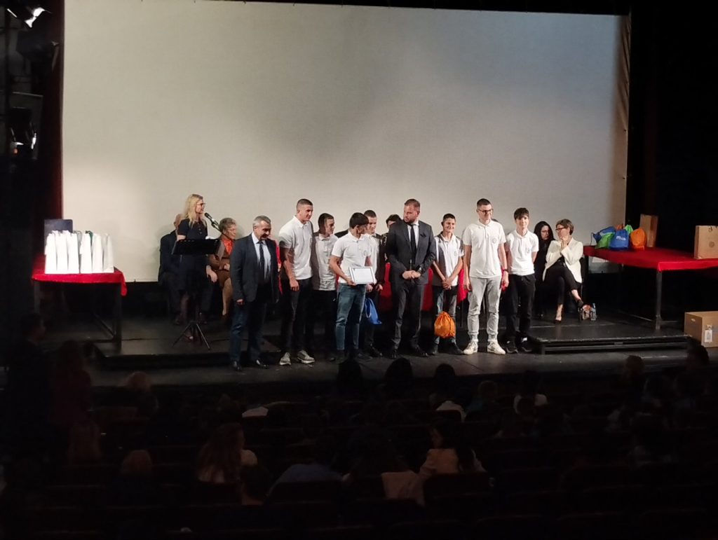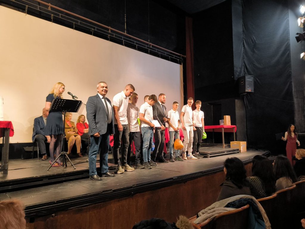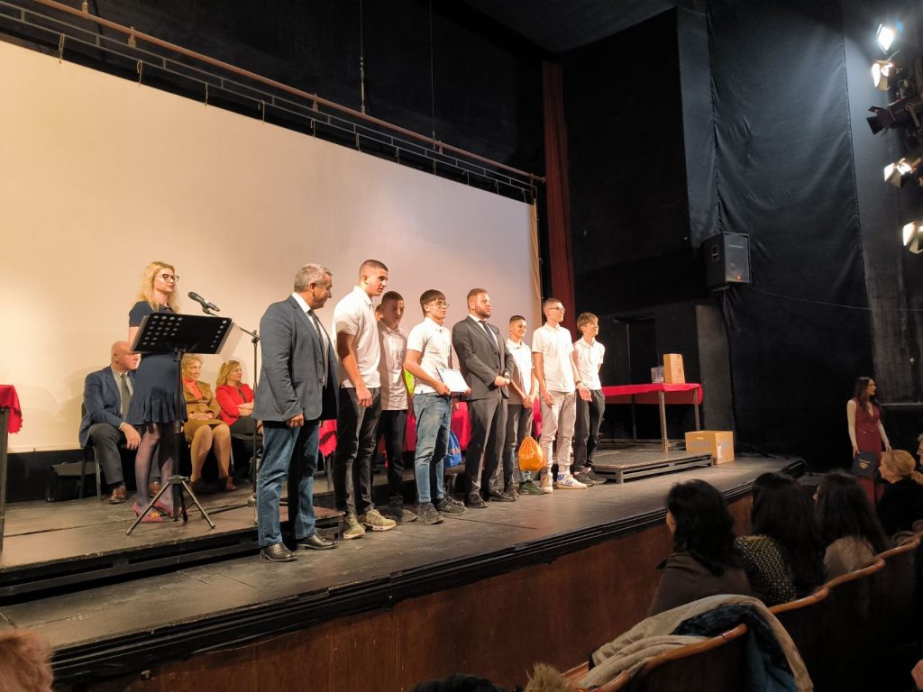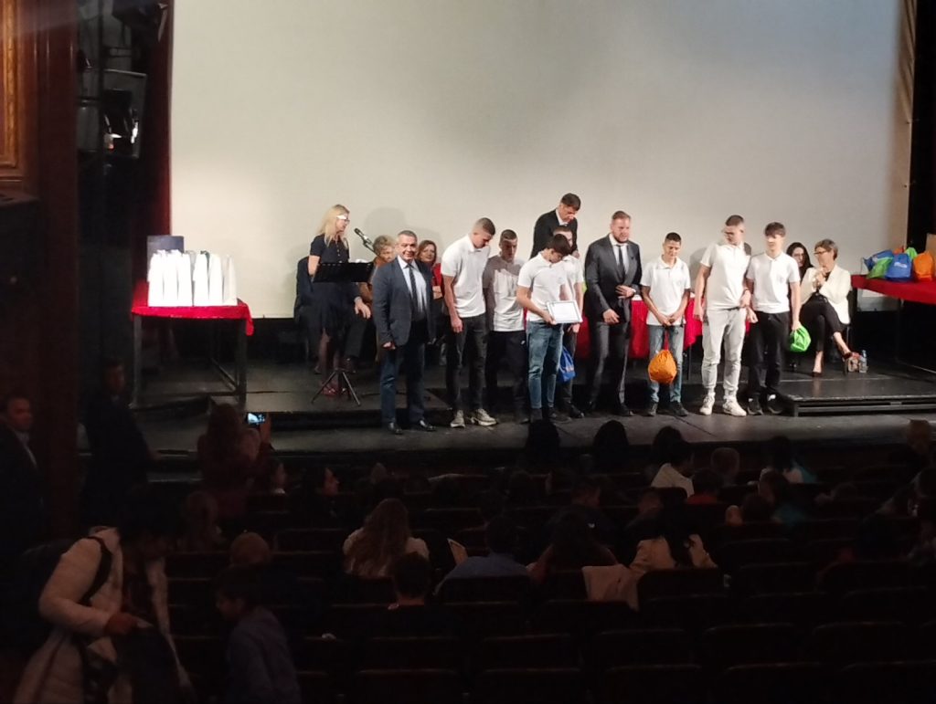 Група ученици от IX клас, заедно със своя ръководител, присъстваха на вълнуващото събитие и получиха заслужения приз! Грамотата за първото място и предметните награди бяха връчени лично от г-н Петър Младенов – заместник-министър на младежта и спорта, който поздрави и се снима с нашите представители.