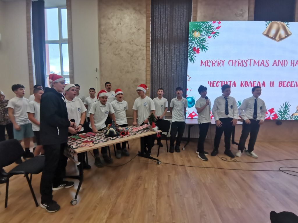 Програмата продължи с представяне на паралелките по английски език чрез сценката “ELF FACTORY & HOLIDAY CHAOS”. Предложената сценка представи забавна история от работилницата на Дядо Коледа, където джуджетата неуморно подготвят подаръци. Джуджета, спортисти и уморени ученици внесоха хумор и настроение, а финалът обедини всички герои в празничен поздрав: „Merry Christmas and Happy Holidays!“