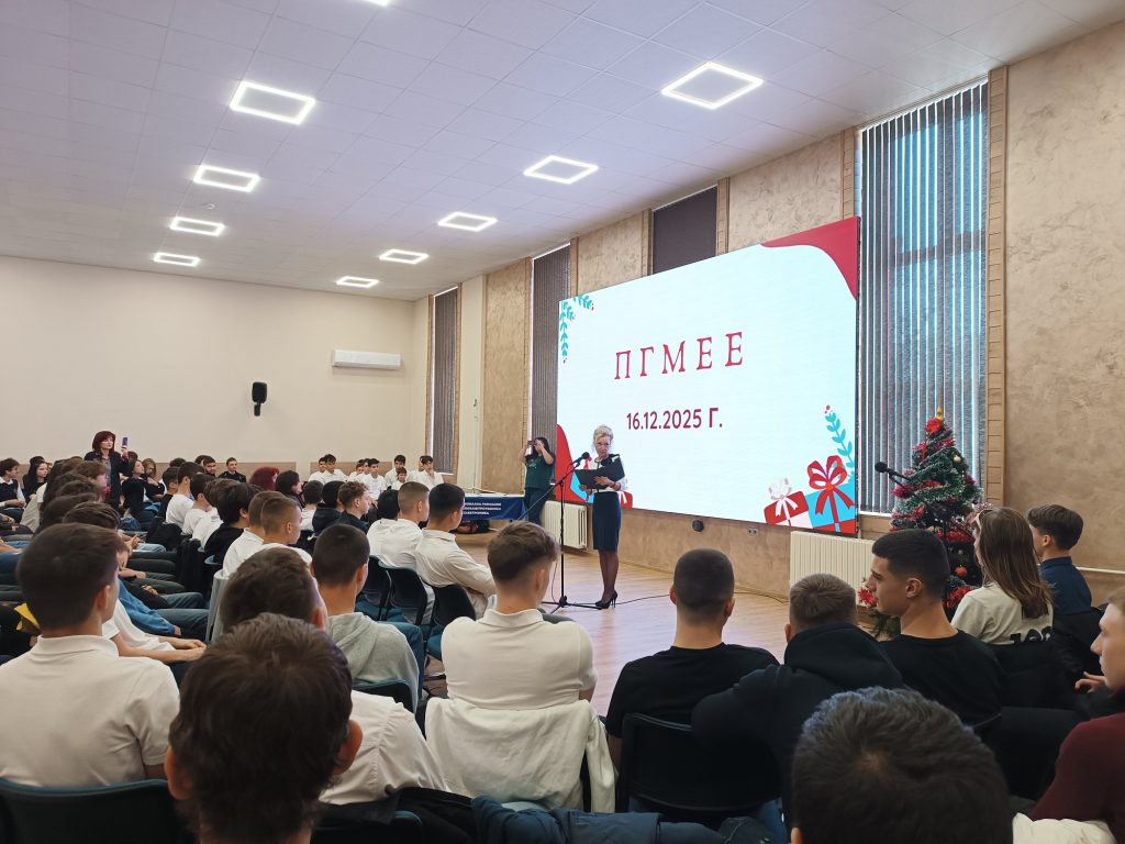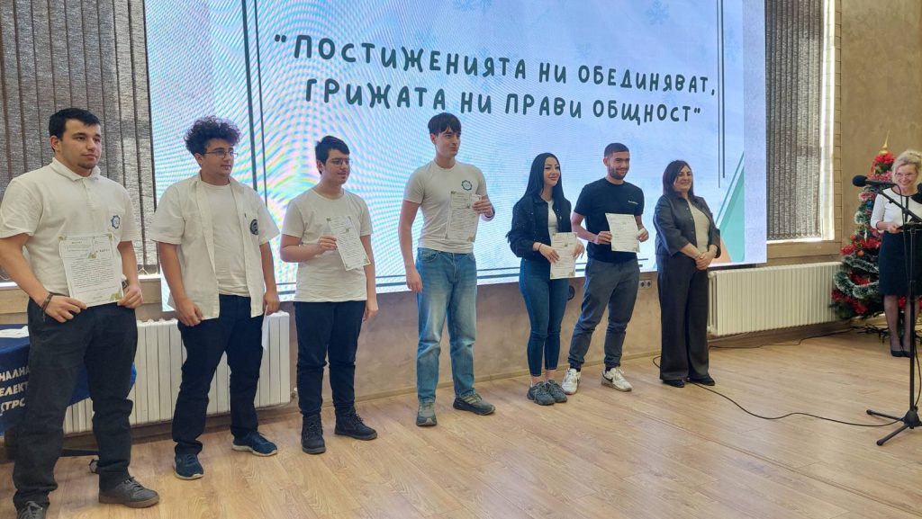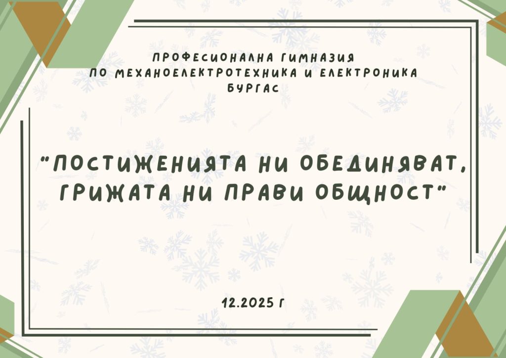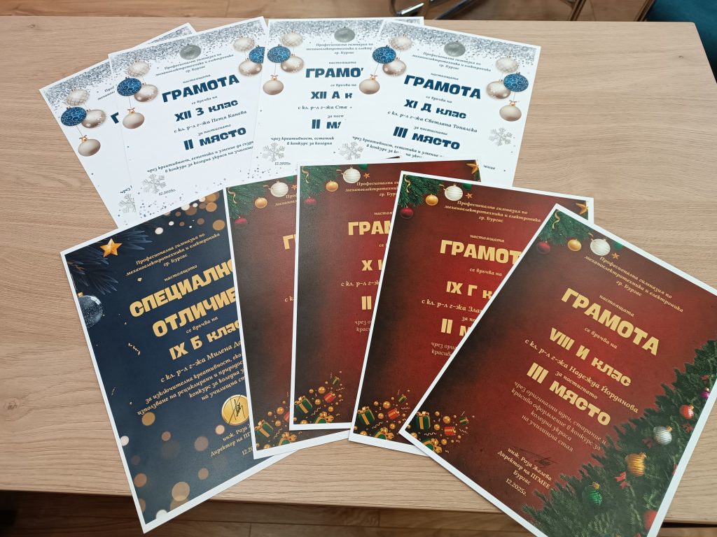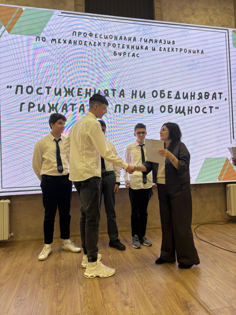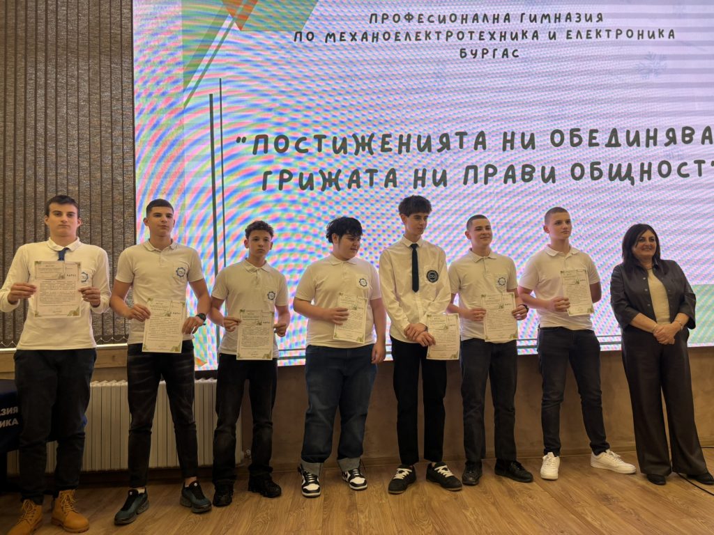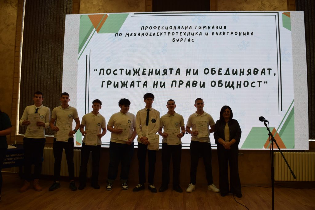 В навечерието на Рождество Христово Професионалната гимназия по механоелектротехника и електроника – Бургас проведе своята традиционна тържествена церемония по връчване на отличия на изявени ученици. Събитието се състоя в актовата зала на гимназията в пръствието на родители и учители и премина под мотото „Постиженията ни обединяват, грижата ни прави общност“.
