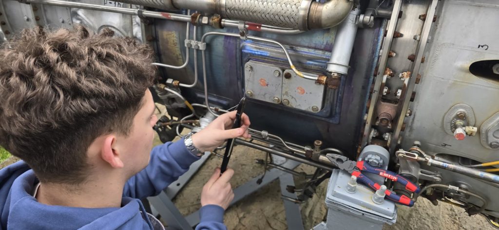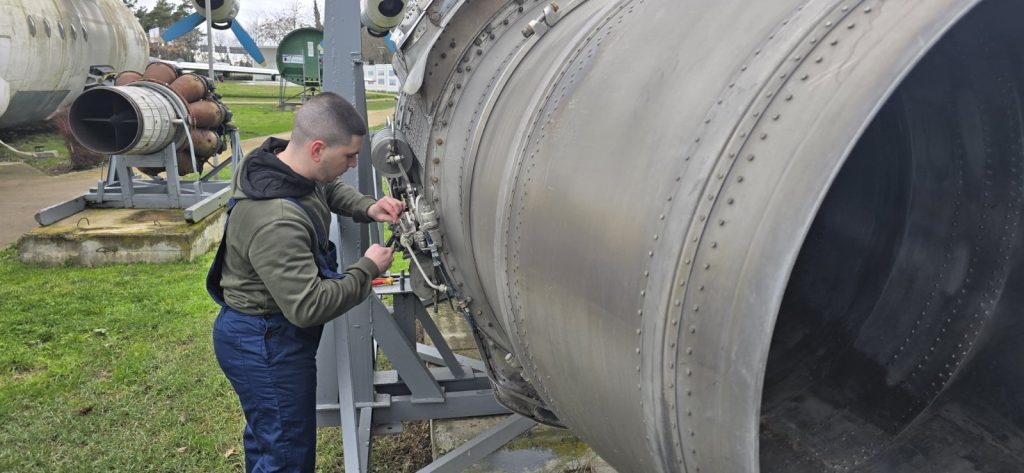 След приключване на теоретичната част учениците преминаха към практическа демонстрация. На територията на музея те показаха умения за законтряне с предпазна тел на крепежни елементи по авиационни двигатели, експонирани в музейната експозиция. Демонстрацията бе изпълнена прецизно и отговорно, при спазване на изискванията за безопасност и технологична последователност.