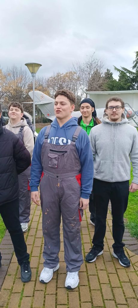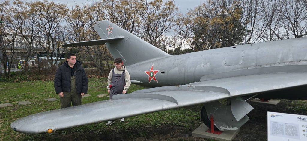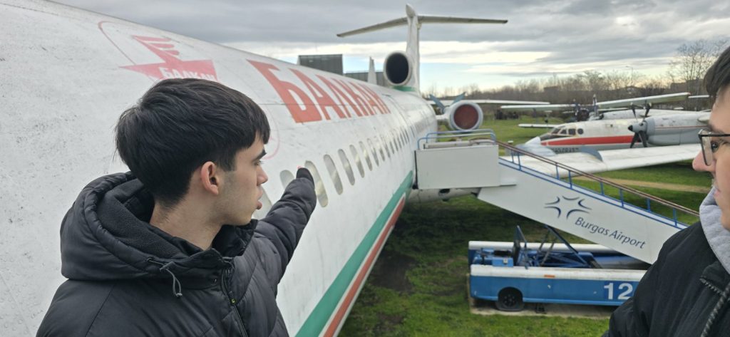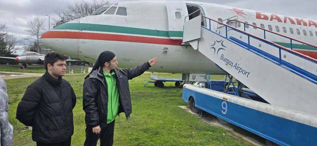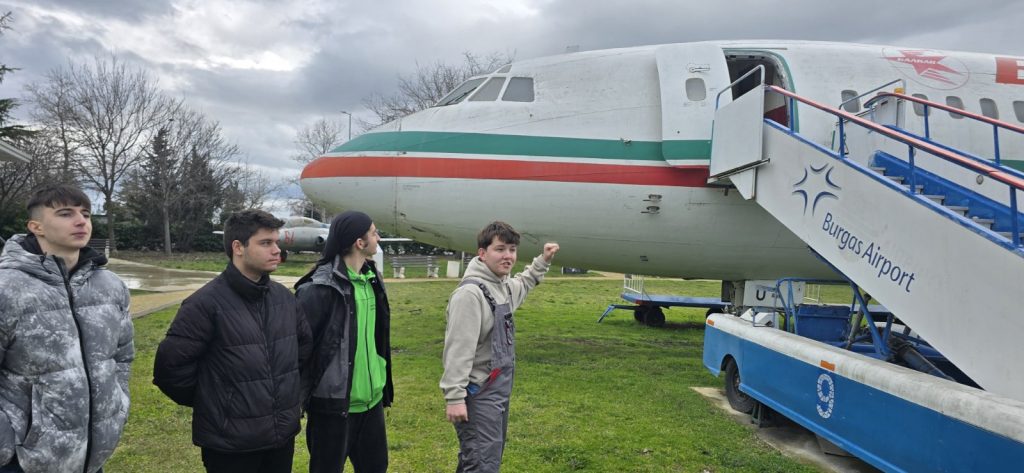 На 25.02.2026 г. в Авиомузей Бургас се проведе бинарен урок между предметите „Учебна практика – Техническо обслужване на самолета“ и „Чужд език по професията – авиационен английски език“ с учениците от 11. а клас. Темата на занятието бе „Основни части на самолета и техните функции“.