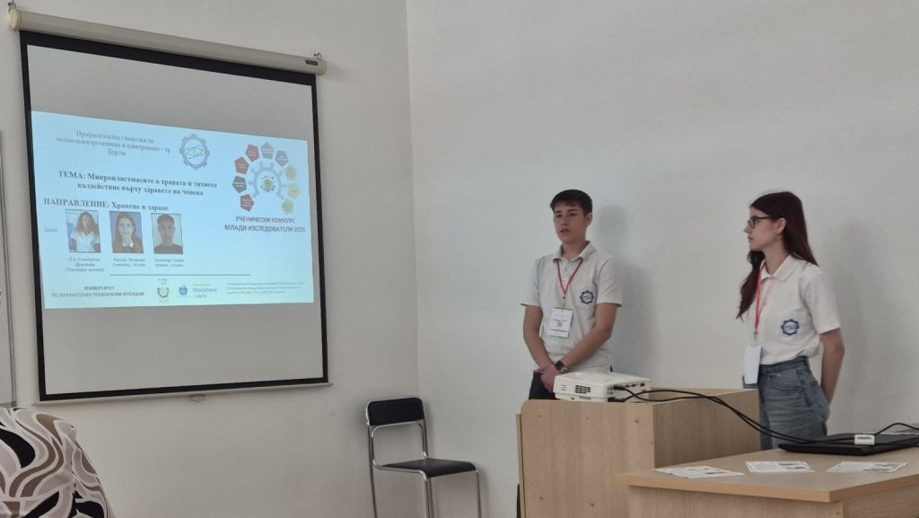 Нашият екип участва в направление „Хранене и здраве“ — една от най-силните и най-оспорвани категории в УХТ. Под менторството на г-жа Димитрина Кръстева, учениците Ралица Чолакова и Божидар Славов от 10 з клас представиха темата „Микропластмасите в храната и тяхното въздействие върху здравето“ — тема, която не е просто научен казус, а тревога, въпрос и предупреждение към всички нас. Макар разработката да не беше отличена с призово място, за нас тя остана победа — победа на смелостта, труда, подготовката и достойното представяне сред изключително силна конкуренция.