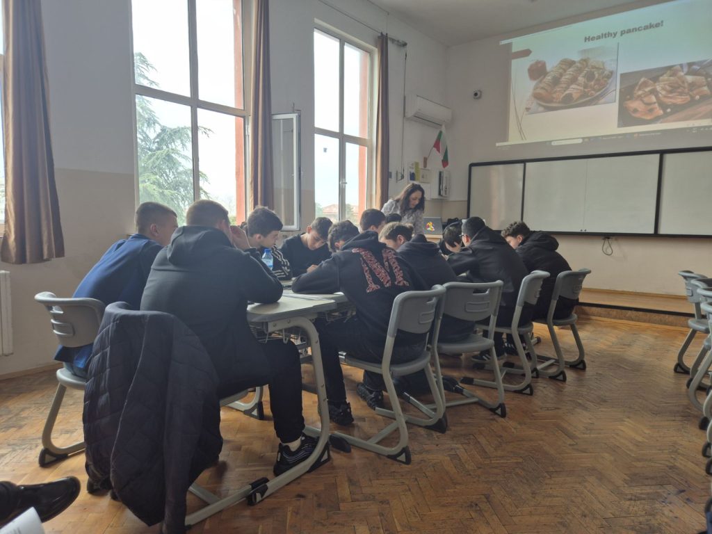 Урокът започна с практическа задача – попълване на липсващи думи в текст на рецепта за овесени палачинки. Участниците се справиха с лекота с поставеното предизвикателство и разбраха как могат да си приготвят лесно и вкусно здравословна храна вкъщи.
